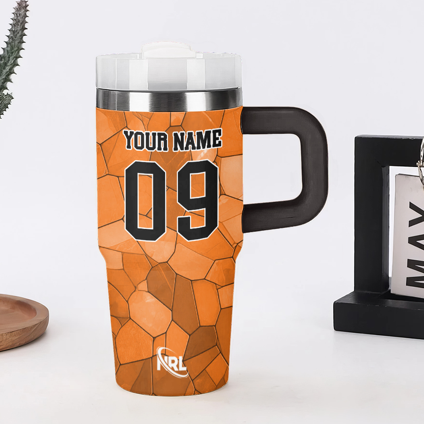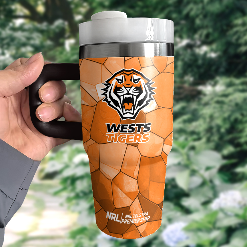 Auspiritmerch Wests Tigers Custom Stanley Quencher 14oz Stainless Steel Tumbler With Handle $34.95